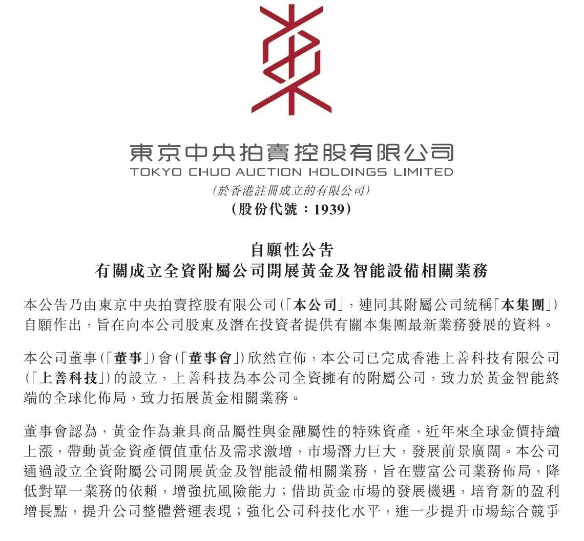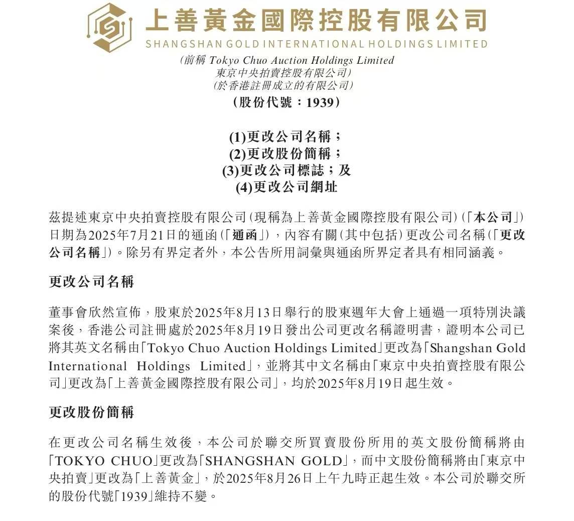 东京中央拍卖更名为“上善黄金国际控股有限公司”