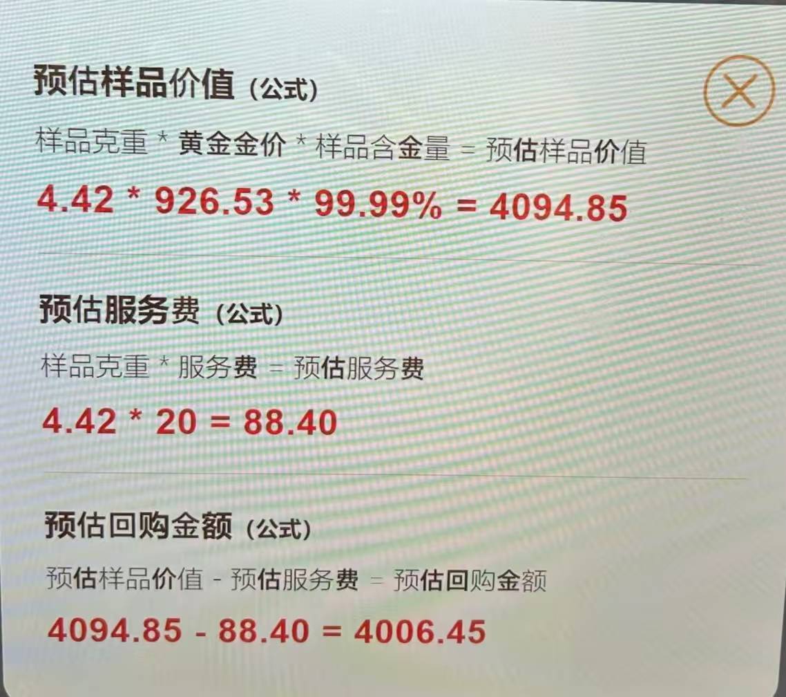 检测后结合金价给出预估样品价值,以及扣除服务费的预估回购金额等信息