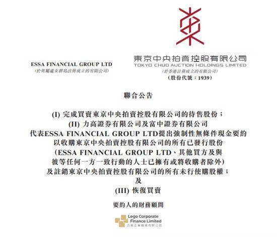 东京中央拍卖控股联合公告 ,金雅福集团收购东京中央拍卖75%的股权