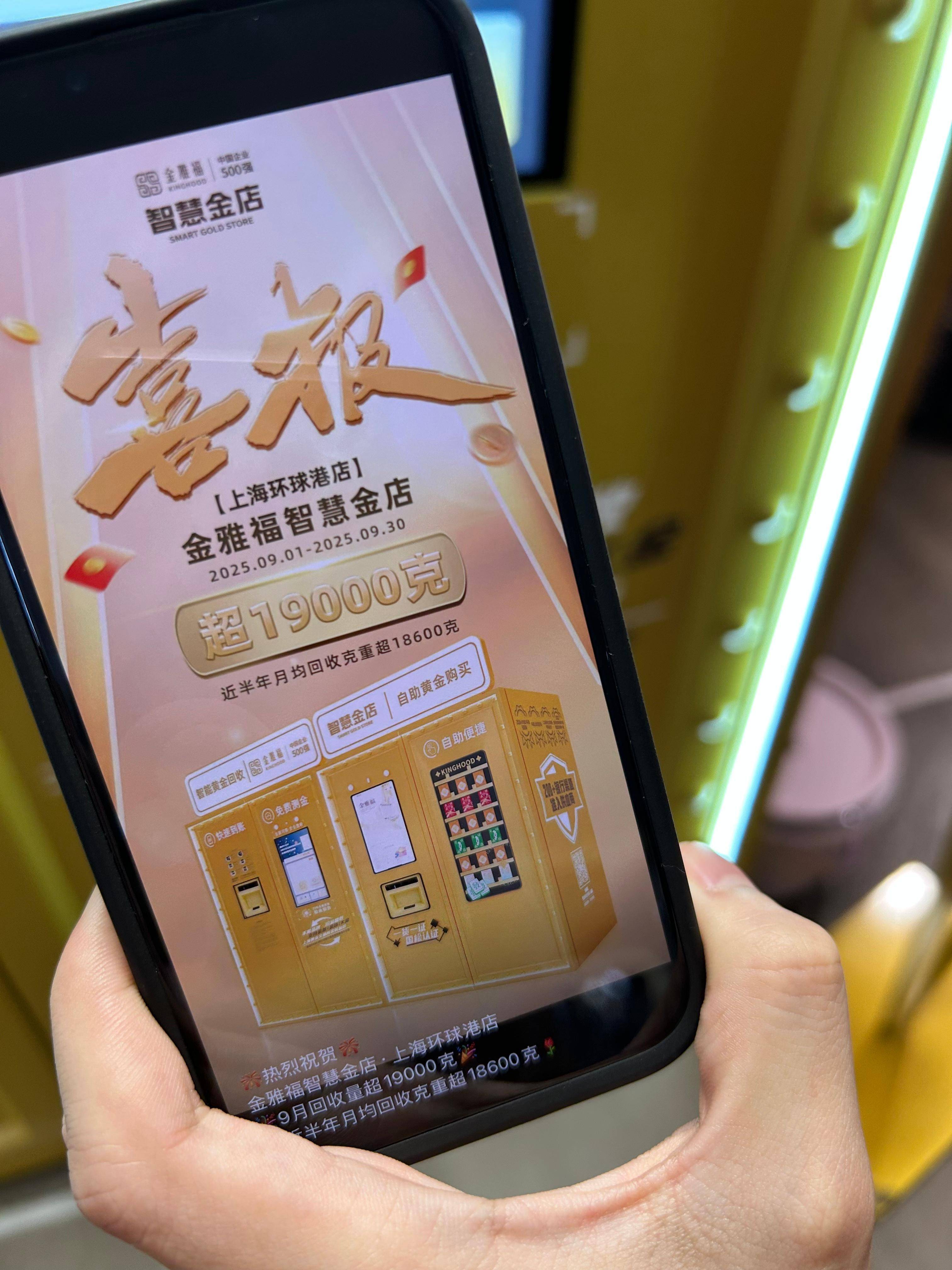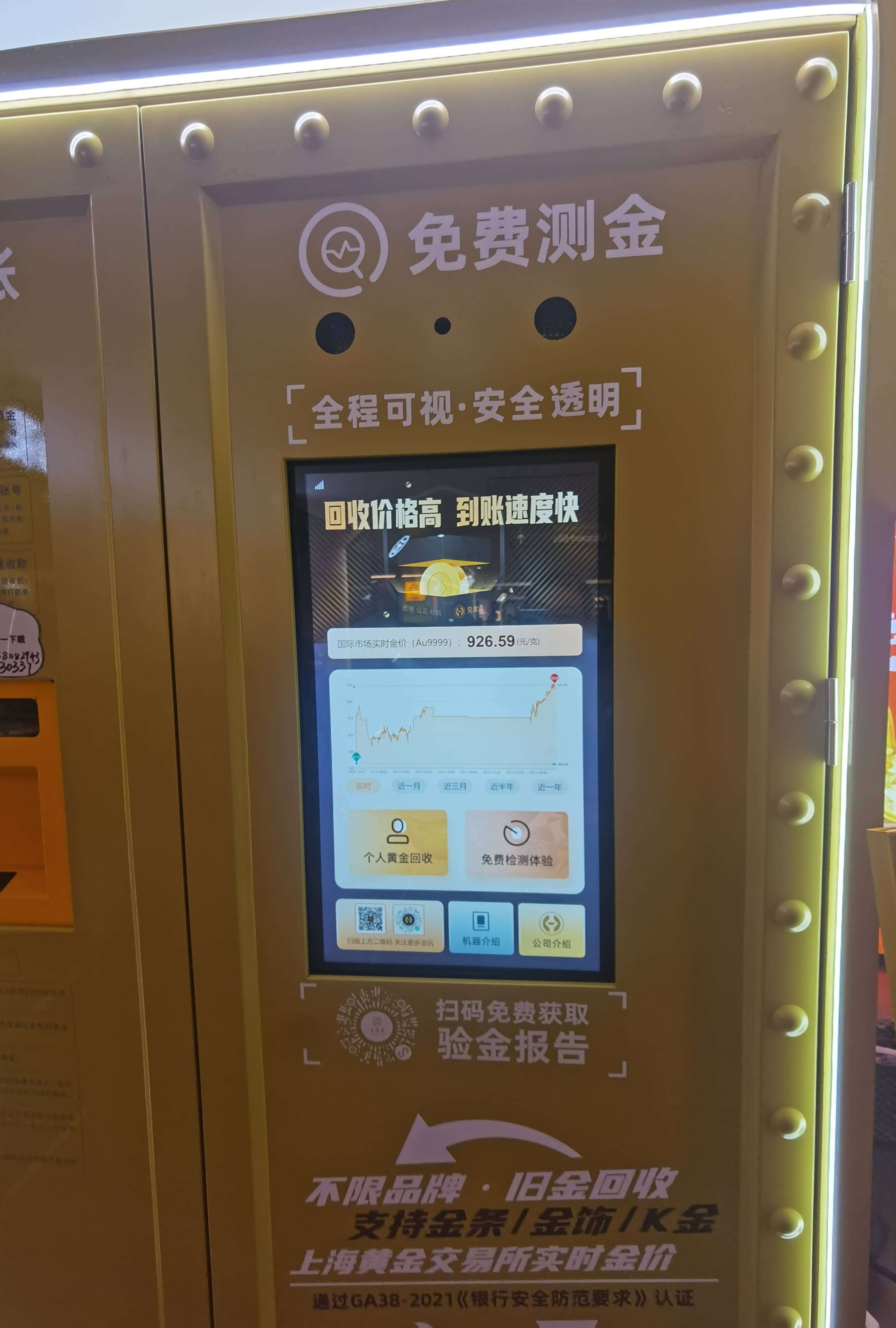 深圳深业上城南区商场位置就有这样一家“智慧金店”。10月14日,记者实地看到,这台外观酷似ATM的设备醒目的标着“全程可视,安全透明”,屏幕上则显示着国际市场实时金价。机器提供含金量在50%以上,重量3克以上、1000克以内的黄金回收服务。但同时,其自助售卖终端也出售“小克重、轻量化”黄金产品。